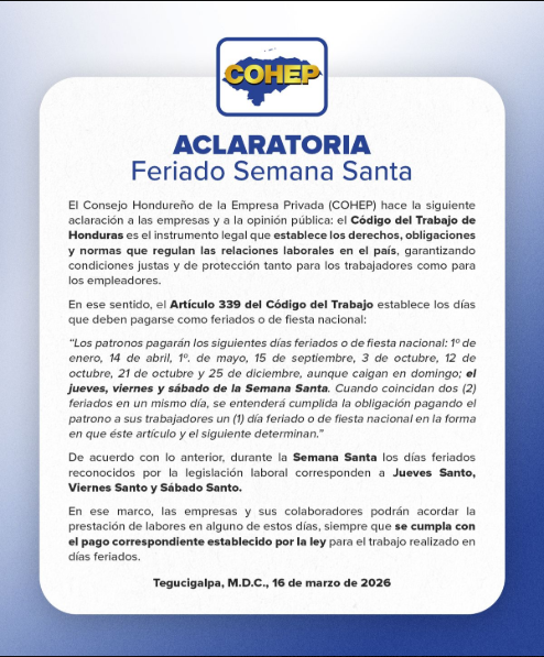 Tegucigalpa. Autoridades laborales emitieron una aclaratoria sobre los días feriados correspondientes a la Semana Santa, ante dudas y reclamos de trabajadores en el país.