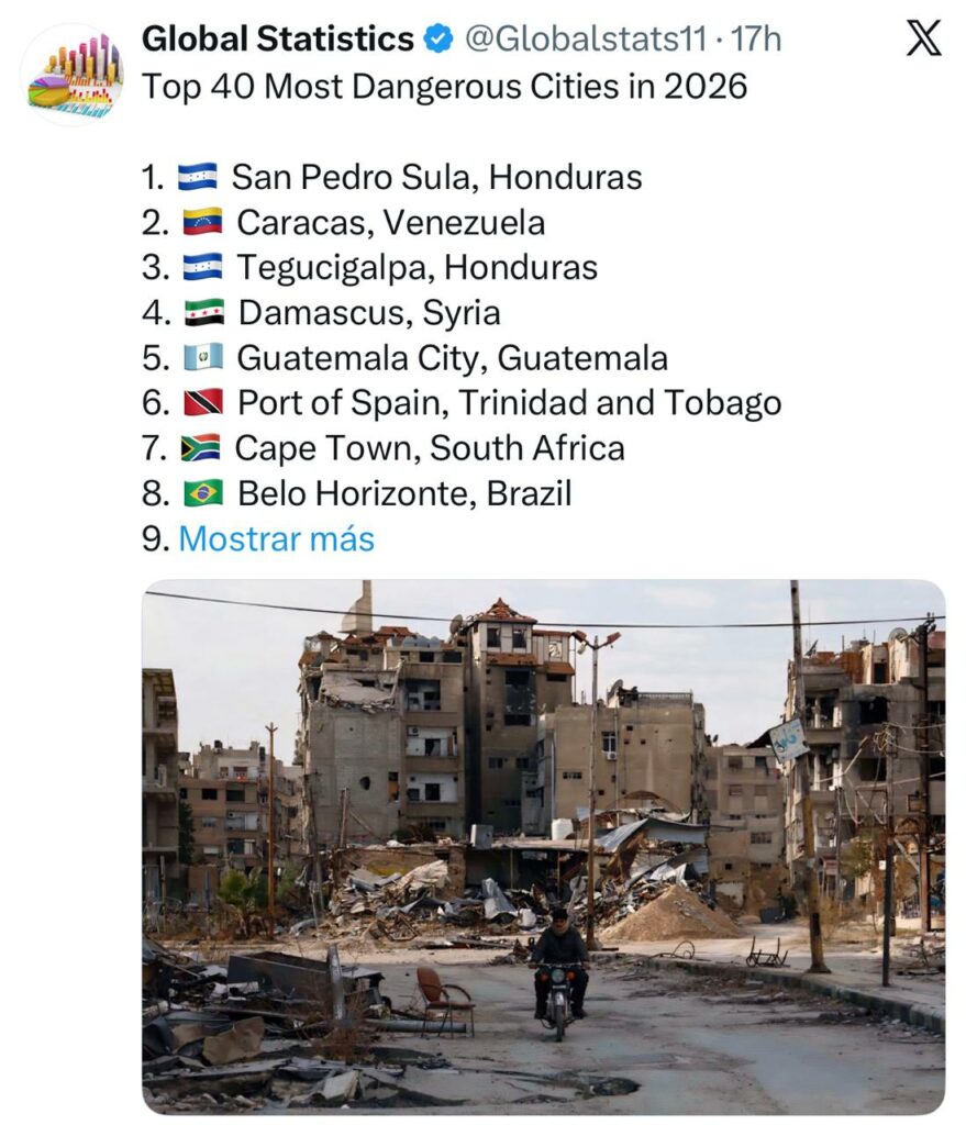 De acuerdo con un reciente reporte de Global Statistics, Honduras enfrenta un serio desafío de seguridad al posicionar a sus dos principales ciudades en el podio de las más peligrosas del mundo para el año 2026. San Pedro Sula encabeza la lista mundial en el primer lugar, seguida de cerca por Tegucigalpa, que ocupa la tercera posición, superando incluso a ciudades en zonas de guerra como Damasco, Siria.