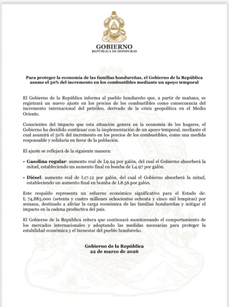 Finalmente, Asfura reiteró que el gobierno continuará evaluando el comportamiento del mercado internacional. Aseguró que la prioridad es proteger el bolsillo de las familias hondureñas. El presidente insistió en que el Estado mantendrá acciones para mitigar el efecto del alza en los combustibles.