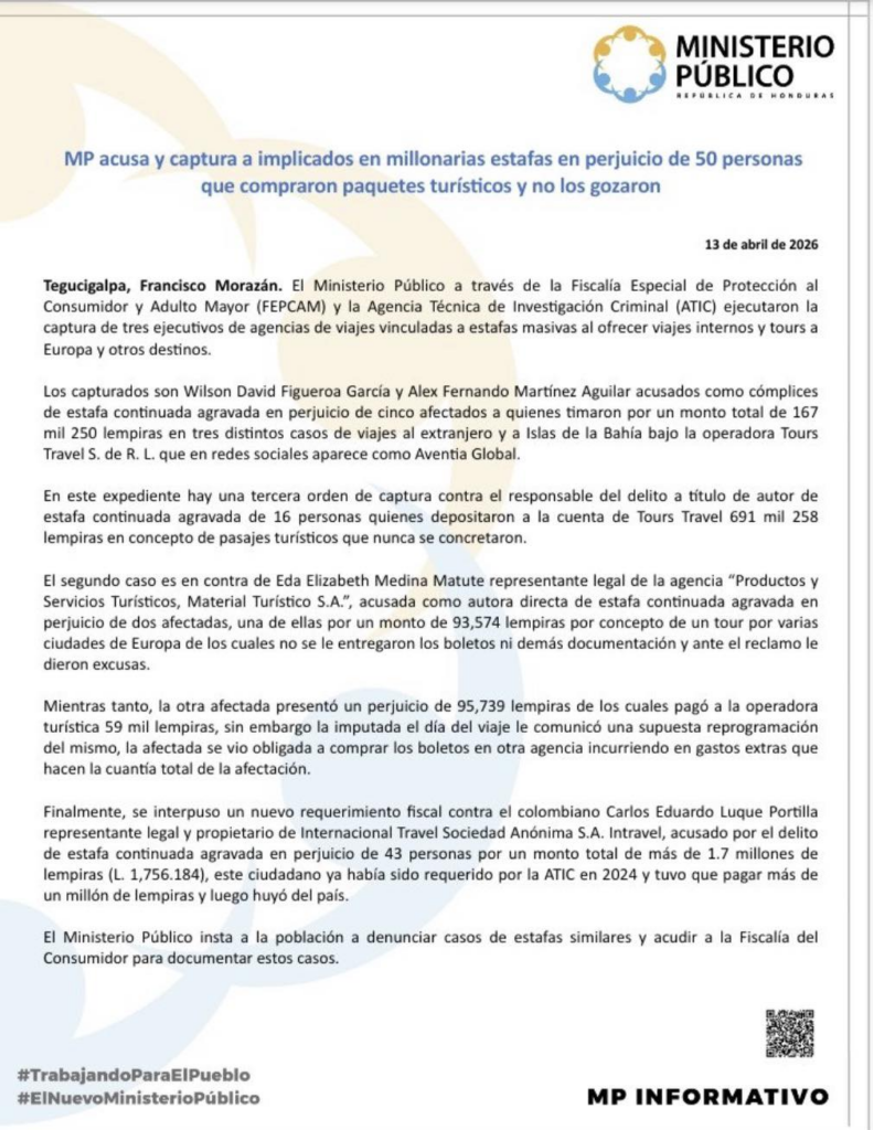 - Caso Intravel (Internacional Travel): El Ministerio Público presentó un requerimiento contra el colombiano Carlos Eduardo Luque Portilla, acusado de estafar a 43 personas por un total de L 1,756,184. Luque Portilla ya había sido procesado en 2024, pero tras pagar una fianza, huyó del país.