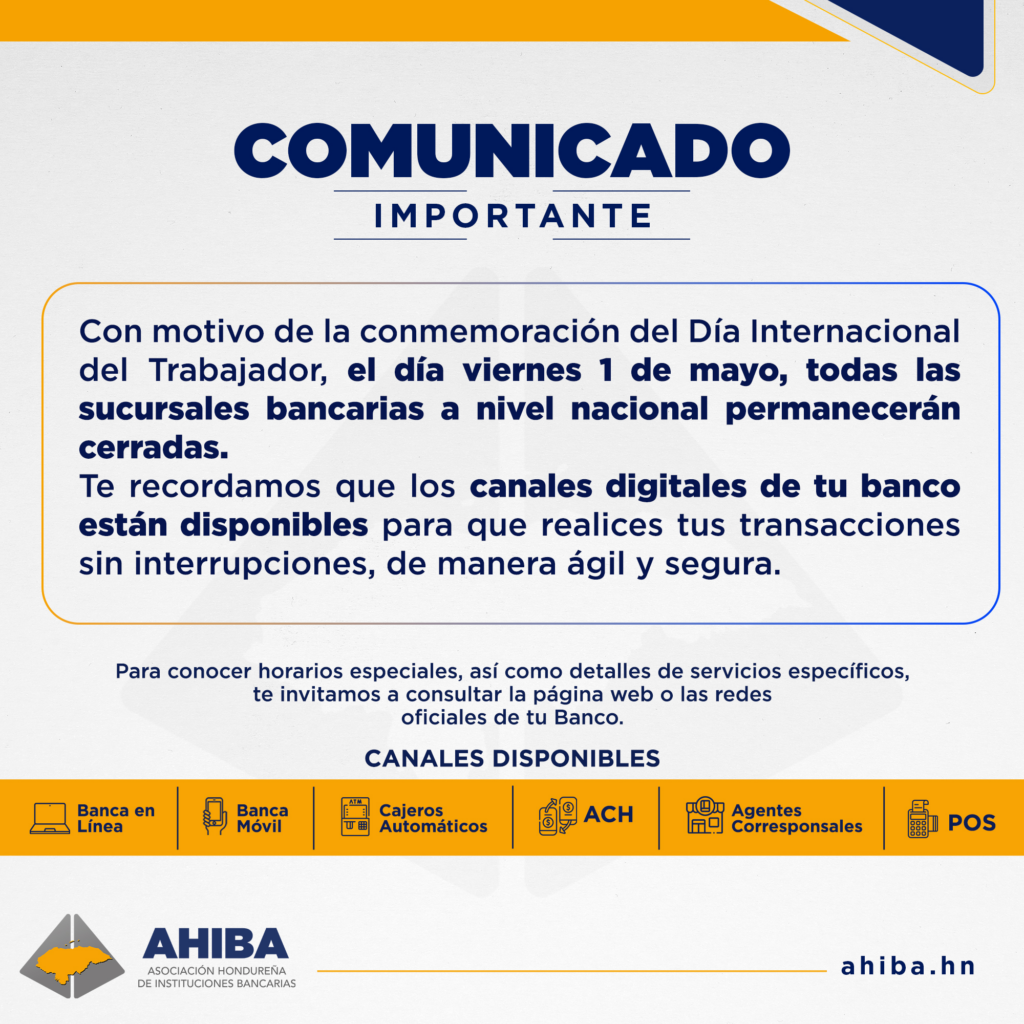 Las agencias bancarias en Honduras permanecerán cerradas el próximo 1 de mayo, en el marco de la conmemoración del Día Internacional del Trabajador, según informó la Asociación Hondureña de Instituciones Bancarias.