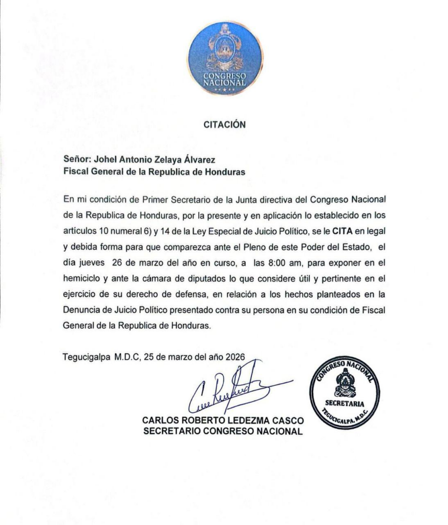 Tegucigalpa.- La Junta Directiva del Congreso Nacional de Honduras emitió este miércoles una citación formal dirigida al Fiscal General de la República, Johel Antonio Zelaya Álvarez, para que comparezca ante el Pleno de diputados en el marco del proceso de juicio político que se instruye en su contra.