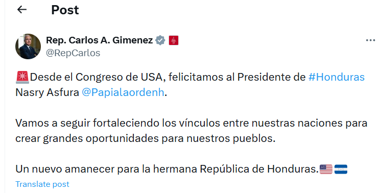 A través de un mensaje oficial, representantes del Congreso estadounidense extendieron sus felicitaciones al mandatario hondureño, calificando el inicio de su gobierno como un “nuevo amanecer” para la nación. En el comunicado, se subrayó la voluntad de Washington de continuar fortaleciendo los vínculos históricos entre ambas naciones.