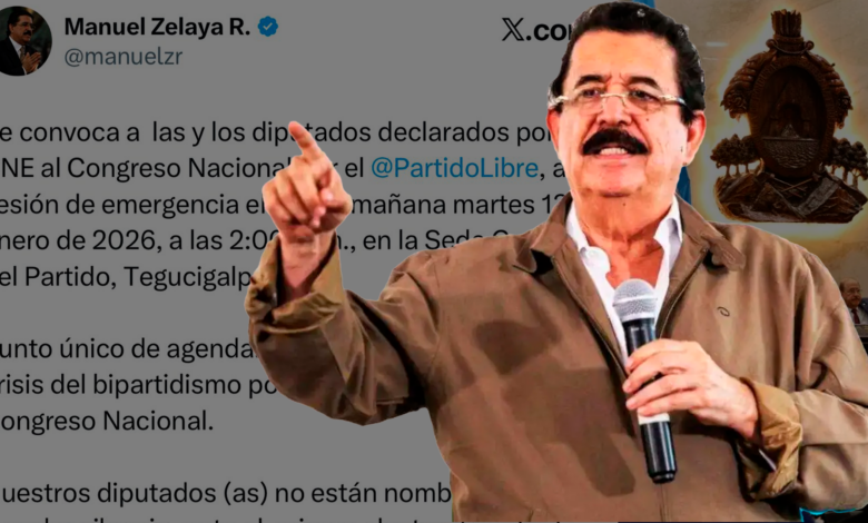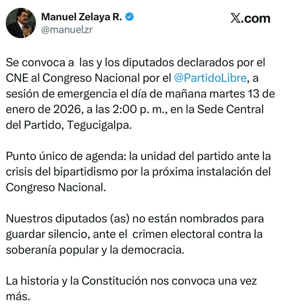 Tegucigalpa.- El coordinador del Partido Libre, Manuel Zelaya Rosales, convocó a las y los diputados electos a una reunión de emergencia para este martes 13 de enero de 2026 en la sede central de Tegucigalpa. El punto único de la agenda es la unidad del partido frente a lo que Zelaya denomina la “crisis del bipartidismo” de cara a la próxima instalación del Congreso Nacional.
