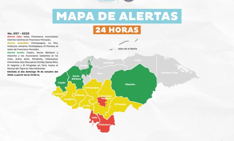 Copeco también informó que se amplía la Alerta Amarilla para los departamentos de Comayagua, La Paz, Intibucá, Lempira, Ocotepeque, El Paraíso y el resto de Francisco Morazán, donde los suelos continúan absorbiendo grandes cantidades de agua y existe riesgo de deslizamientos.