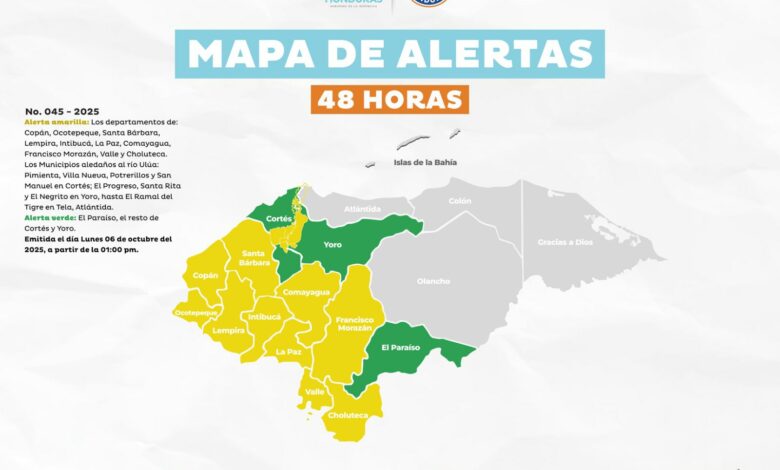 Los departamentos bajo alerta amarilla son: Choluteca, Valle, Francisco Morazán, La Paz, Comayagua, Intibucá, Lempira, Santa Bárbara, Ocotepeque y Copán, mientras que El Paraíso, el resto de Cortés y Yoro permanecen bajo alerta verde por un período de 48 horas a partir de la 1:00 p.m. de este lunes 6 de octubre.