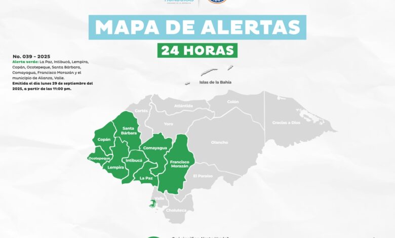 Tegucigalpa, Honduras.- La Comisión Permanente de Contingencias (Copeco) decretó este lunes 29 de septiembre de 2025, a partir de las 11:00 de la noche, una alerta verde por 24 horas en nueve departamentos y un municipio del país, debido a las lluvias pronosticadas para las próximas horas.