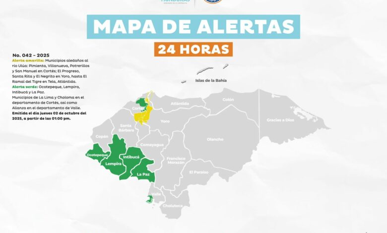 Por su parte, la alerta verde se mantiene en los departamentos de Ocotepeque, Lempira, Intibucá y La Paz, los cuales han registrado acumulados de lluvias que podrían ocasionar desbordamientos, deslizamientos y afectaciones en comunidades vulnerables.
