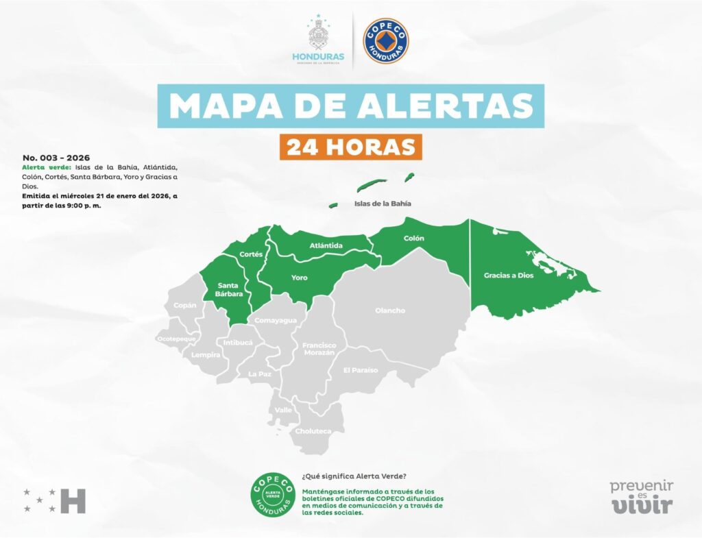 Los departamentos en el nivel de alerta incluye a Islas de la Bahía, Copán, Santa Bárbara, Cortés, Yoro, Atlántida y Colón.