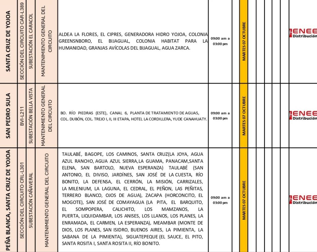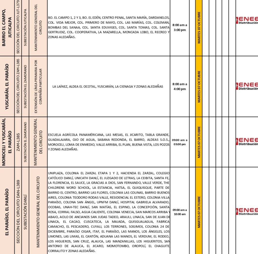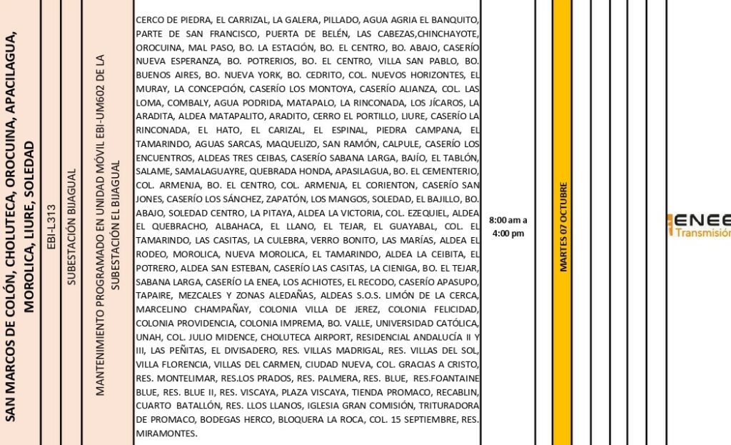 Tegucigalpa, Honduras — La Empresa Nacional de Energía Eléctrica (ENEE) informó que este martes 7 de octubre se realizarán cortes programados de energía en distintas zonas del país, debido a trabajos de mantenimiento en subestaciones eléctricas y líneas de distribución.
