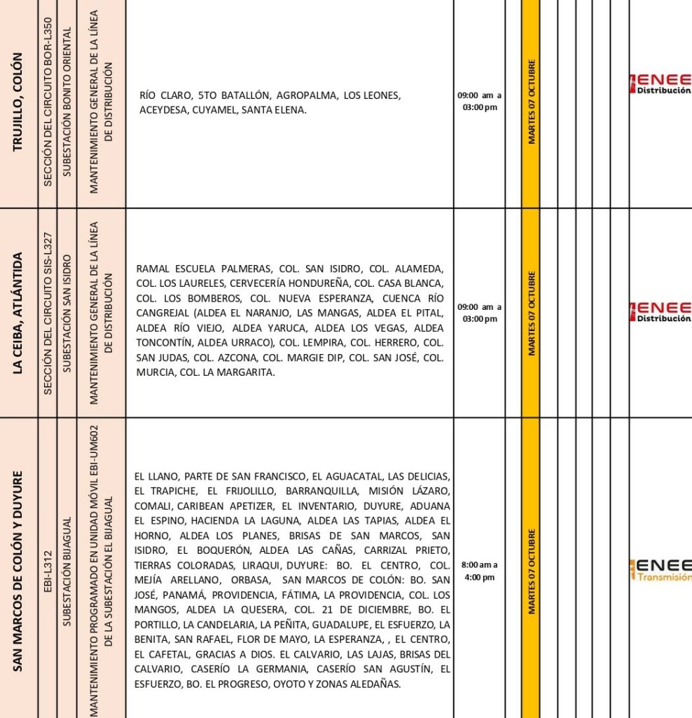 De acuerdo con el comunicado oficial, las labores afectarán a los departamentos de Olancho, El Paraíso, Colón, Atlántida, Cortés y Choluteca, donde se interrumpirá temporalmente el suministro eléctrico durante varias horas del día.