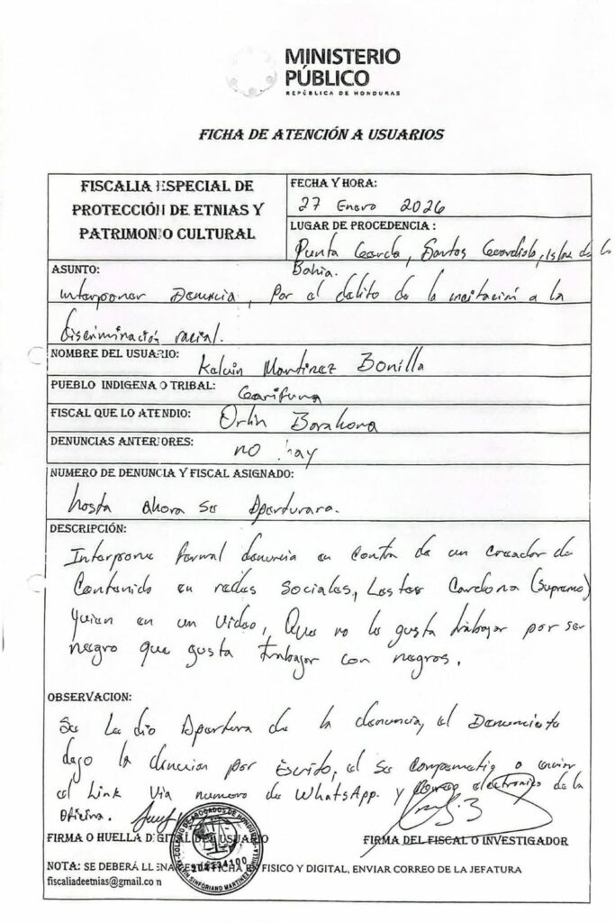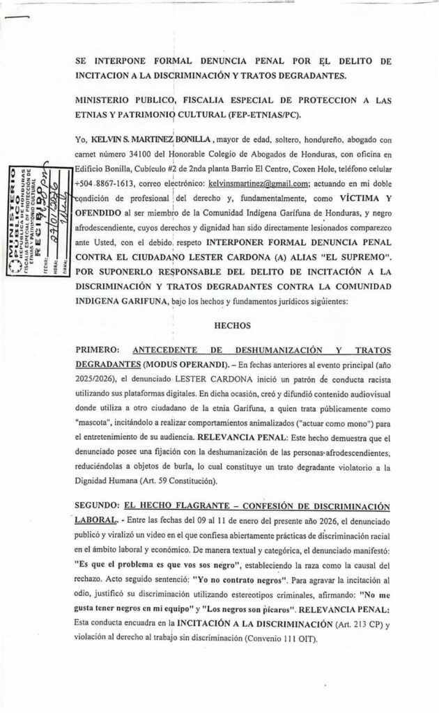 Tegucigalpa. – Este día se formalizó una denuncia penal ante la Fiscalía Especial de Protección a las Etnias y Patrimonio Cultural (FEP-ETNIAS/PC) contra el creador de contenido Lester Cardona, conocido públicamente como “Supremo”. La acción legal señala los delitos de incitación a la discriminación y tratos degradantes contra el pueblo garífuna y la población negra hondureña.