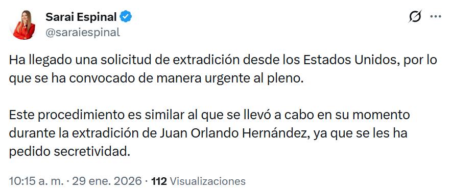 Tegucigalpa.- Una nueva solicitud de extradición enviada por el gobierno de los Estados Unidos ha provocado una convocatoria de urgencia para el pleno de magistrados. La noticia fue confirmada por la diputada del Partido Liberal, Sarai Espinal, quien advirtió sobre la naturaleza crítica de este nuevo requerimiento judicial.