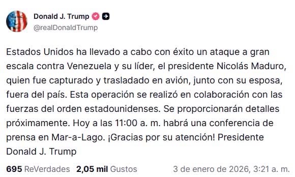 “Estados Unidos ha llevado a cabo con éxito un ataque a gran escala contra Venezuela y su líder, el presidente Nicolás Maduro, fue capturado y trasladado en avión junto con su esposa, fuera del país”, escribió en un mensaje en su red Truth Social.