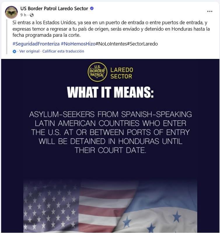 El anuncio fue difundido a través de una publicación oficial en Facebook de la Patrulla Fronteriza, donde se detalla que cualquier persona que ingrese a Estados Unidos, ya sea por un puerto de entrada o de manera irregular, y manifieste temor de regresar a su país de origen, será trasladada a Honduras hasta que se le asigne su cita judicial.