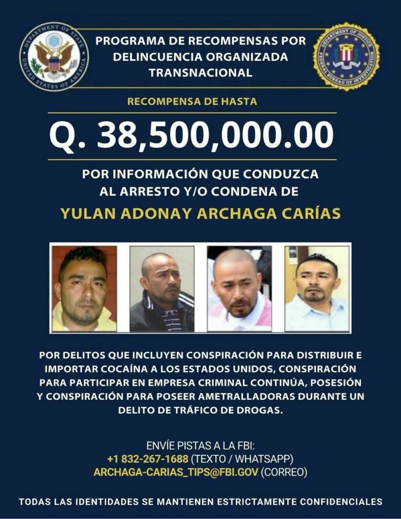 Archaga Carías figura en la lista de los 10 Más Buscados del Federal Bureau of Investigation (FBI). También aparece en los listados de la Drug Enforcement Administration (DEA) y de Homeland Security Investigations (HSI). El Departamento de Estado ofrece una recompensa de hasta 5 millones de dólares por información que lleve a su captura o condena.