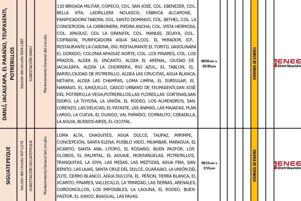 Tegucigalpa, Honduras – La Empresa Nacional de Energía Eléctrica (ENEE) informó sobre cortes de energía programados para este viernes 30 de enero de 2026 en varias zonas del país, como parte de los trabajos de mantenimiento preventivo que se realizan en la red eléctrica nacional.