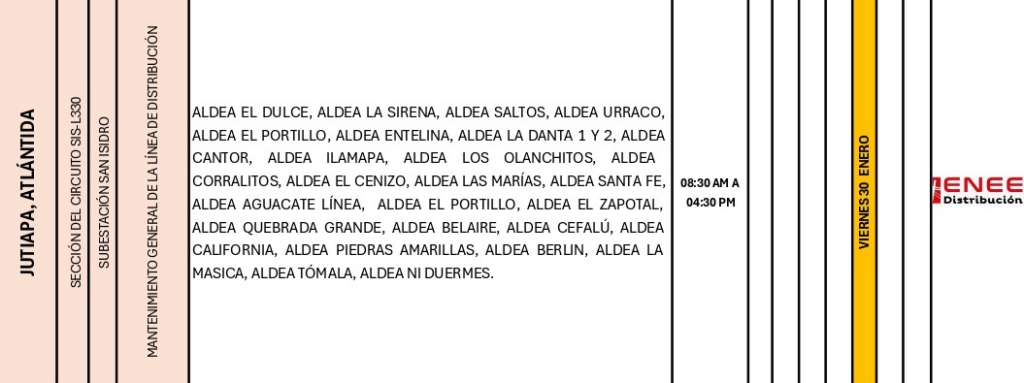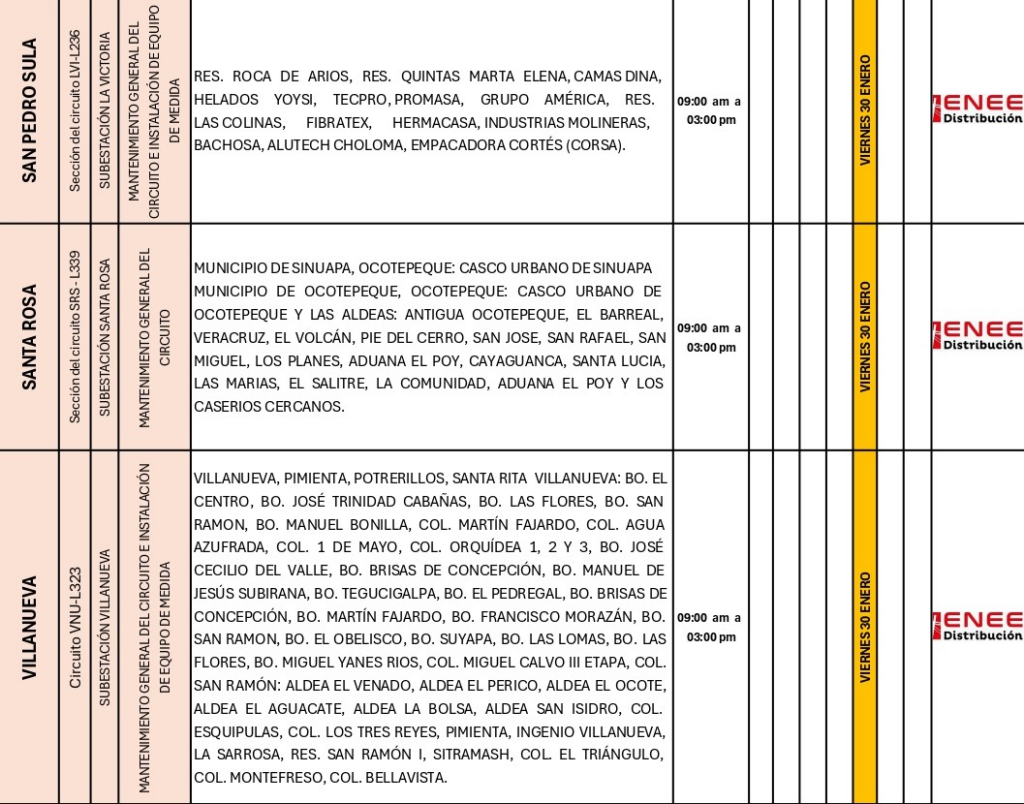 De acuerdo con el comunicado oficial difundido en sus plataformas digitales, las interrupciones del servicio se ejecutarán en sectores de los departamentos de Cortés, Atlántida, Copán, Comayagua y El Paraíso, con el objetivo de fortalecer el sistema de distribución y reducir fallas futuras.