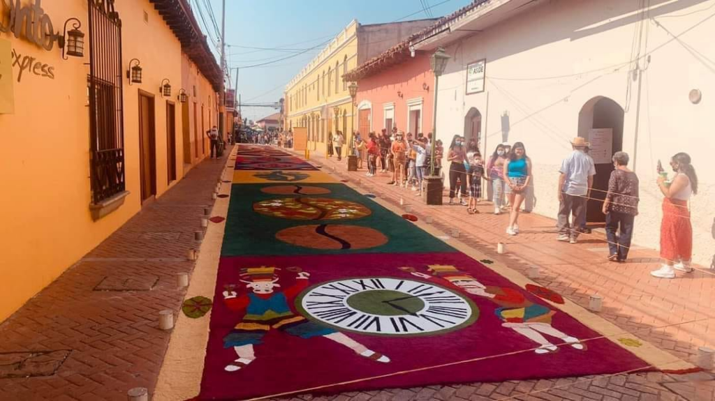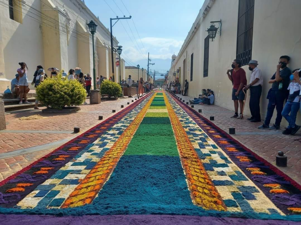 2. La Esperanza y Gracias: En el occidente del país, las alfombras incorporan elementos de la cultura lenca, fusionando la fe católica con símbolos de la identidad indígena, utilizando granos básicos y flores de la región.