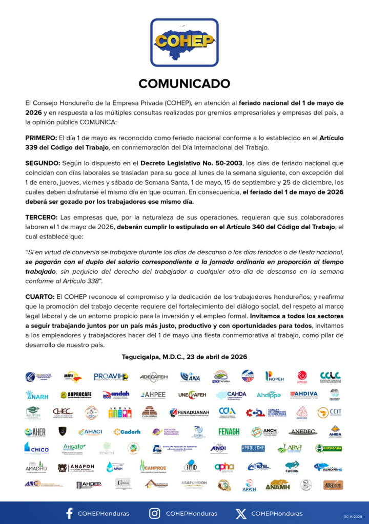 Tegucigalpa.- El Consejo Hondureño de la Empresa Privada (COHEP) oficializó este jueves, mediante un comunicado dirigido a los gremios empresariales y al público en general, que el feriado correspondiente al 1 de mayo de 2026 se mantiene inamovible. De esta manera, el sector privado aclara las dudas sobre posibles traslados de la fecha, ratificando el cumplimiento de la normativa laboral vigente.