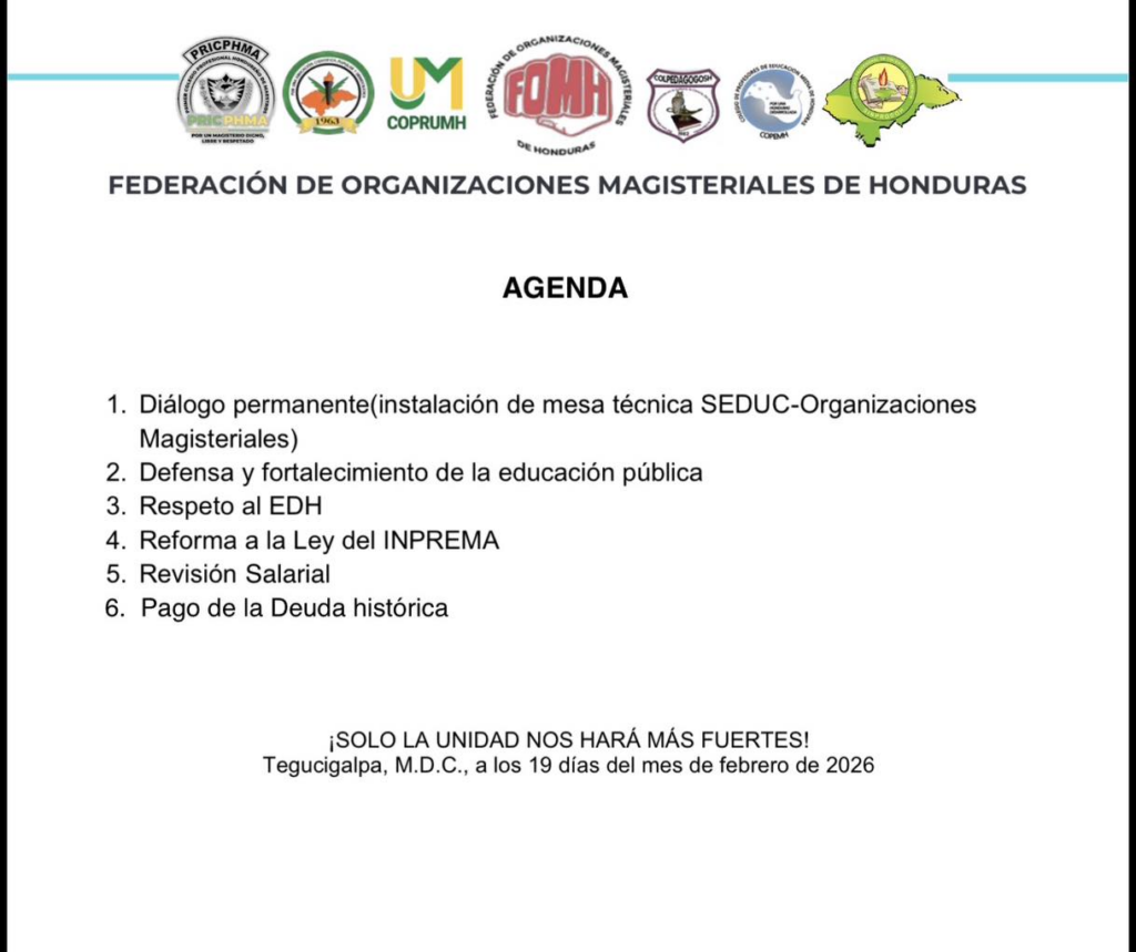 Tegucigalpa, Honduras – La Federación de Organizaciones Magisteriales de Honduras (FOMH) sostuvo una reunión clave con la Secretaría de Educación de Honduras, en la que presentó una agenda de seis puntos considerada prioritaria para la defensa de la educación pública y la reivindicación de derechos históricos del gremio docente.