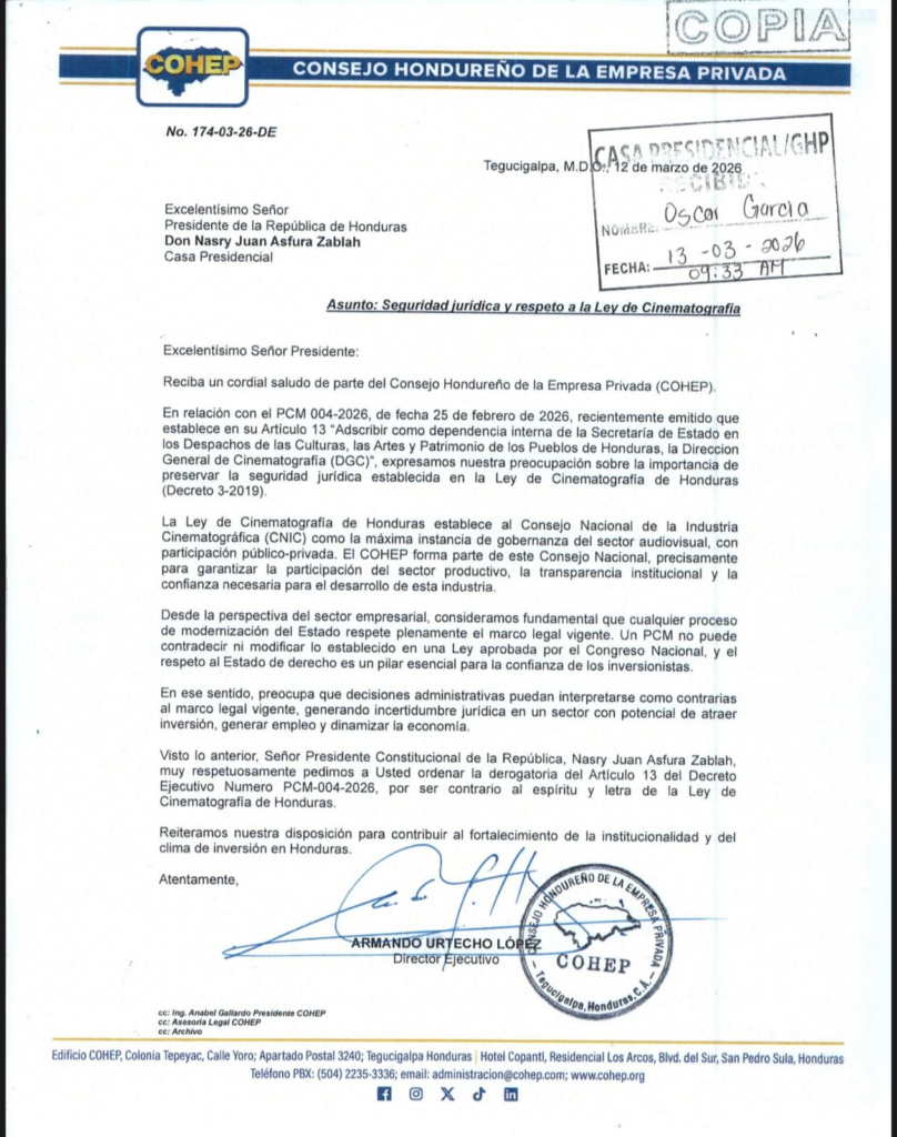 Tegucigalpa.- El Consejo Hondureño de la Empresa Privada (COHEP) ha enviado una enérgica comunicación formal al presidente Nasry “Tito” Asfura, solicitando la derogatoria inmediata del Artículo 13 del Decreto Ejecutivo Número PCM-004-2026. Esta acción de la cúpula empresarial surge ante la preocupación de que la medida administrativa atente directamente contra la seguridad jurídica y la gobernanza del sector audiovisual en el país, generando una incertidumbre que podría ahuyentar a los inversionistas.