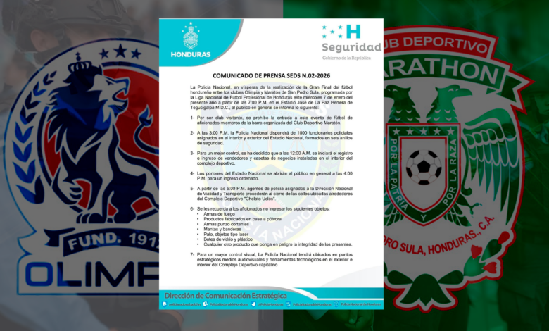 Tegucigalpa. – La Policía Nacional desplegará este miércoles un contingente de 1,000 funcionarios policiales distribuidos en seis anillos de seguridad para garantizar el orden durante la final entre Olimpia y Marathón. Las autoridades confirmaron que, por seguridad y debido a su condición de visitante, queda estrictamente prohibido el ingreso de la barra organizada del Club Marathón al recinto deportivo.