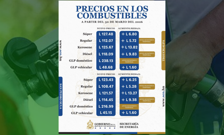 Tegucigalpa.- La Secretaría de Energía (SEN) oficializó la nueva estructura de precios que entrará en vigencia a partir de las 6:00 a. m. del lunes 30 de marzo de 2026. El ajuste refleja incrementos significativos en todos los derivados, destacando el Kerosene con un alza superior a los 13 lempiras, convirtiéndose en el derivado con el impacto más severo para la economía doméstica esta semana.