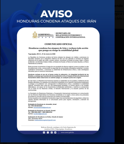 La Cancillería advirtió que estos ataques aumentan el riesgo de una escalada regional. También señaló que la situación pone en peligro la vida de civiles y compromete la seguridad de comunidades extranjeras que residen en esos países, entre ellas ciudadanos hondureños.