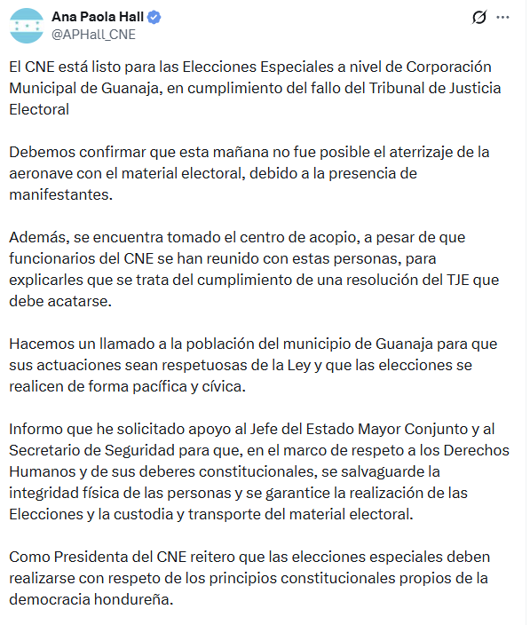 “Hacemos un llamado a la población de Guanaja para que sus actuaciones sean respetuosas de la Ley y que las elecciones se realicen de forma pacífica y cívica”, expresó la consejera presidenta, reiterando que las resoluciones del TJE son de obligatorio acatamiento para el fortalecimiento de la democracia hondureña.