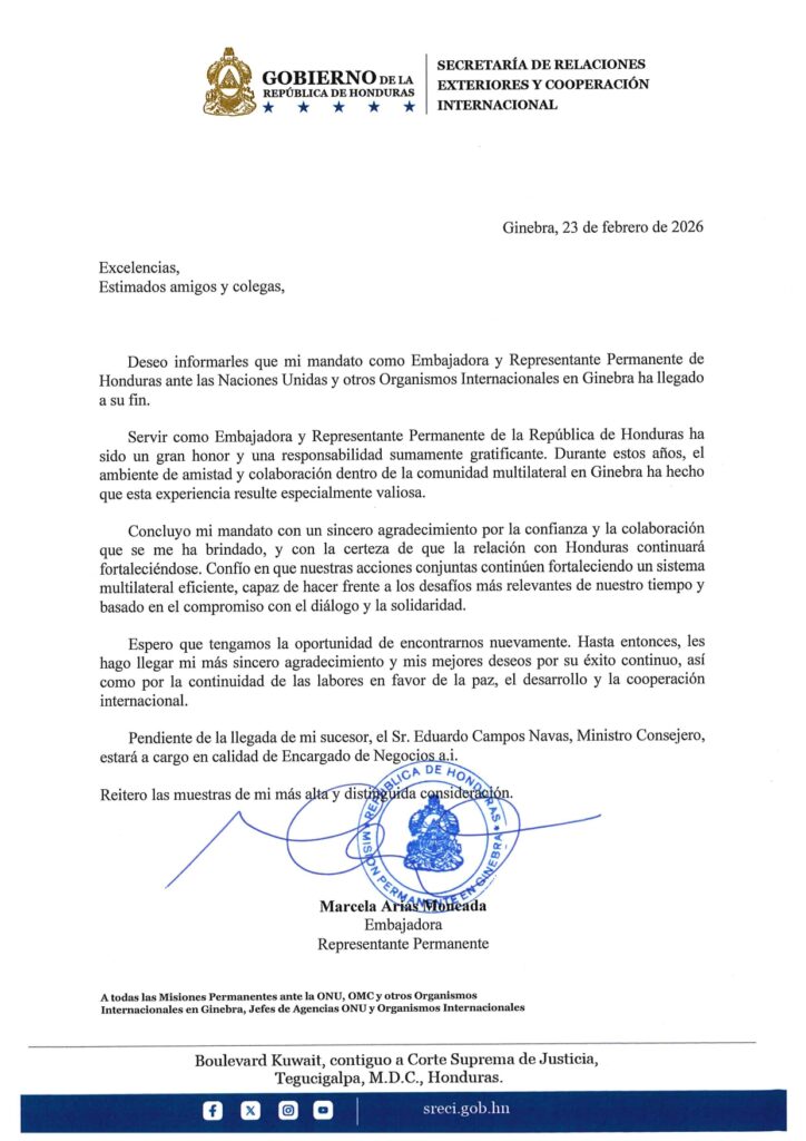 En una misiva fechada el 23 de febrero de 2026, Arias notificó a todas las misiones permanentes acreditadas ante la ONU, la OMC y otros organismos internacionales sobre la culminación de su gestión diplomática, agradeciendo el respaldo y la colaboración recibida durante su período al frente de la representación hondureña.