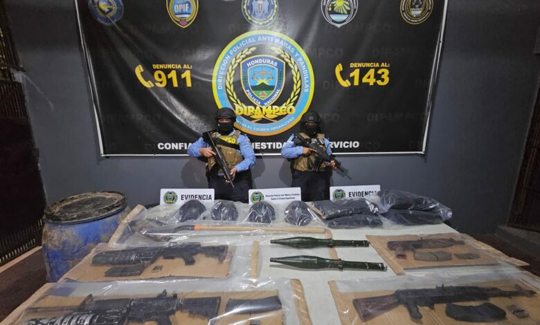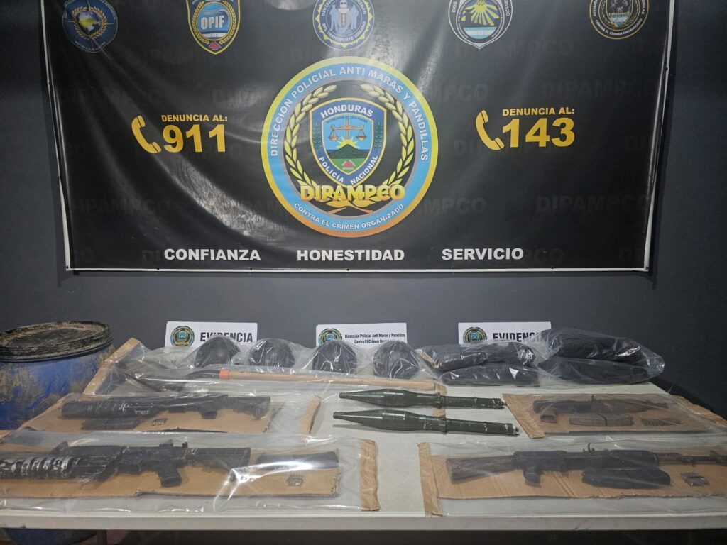 La Lima, Cotés – La Dirección Policial Anti Maras y Pandillas Contra el Crimen Organizado (DIPAMPCO) logró un importante decomiso de armamento de uso prohibido, lanza granadas y equipo táctico en el marco de la Operación Alcázar, en una finca bananera de la aldea Protección, municipio de La Lima, Cortés.