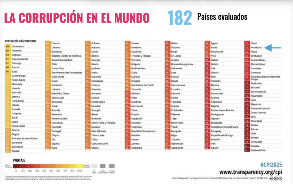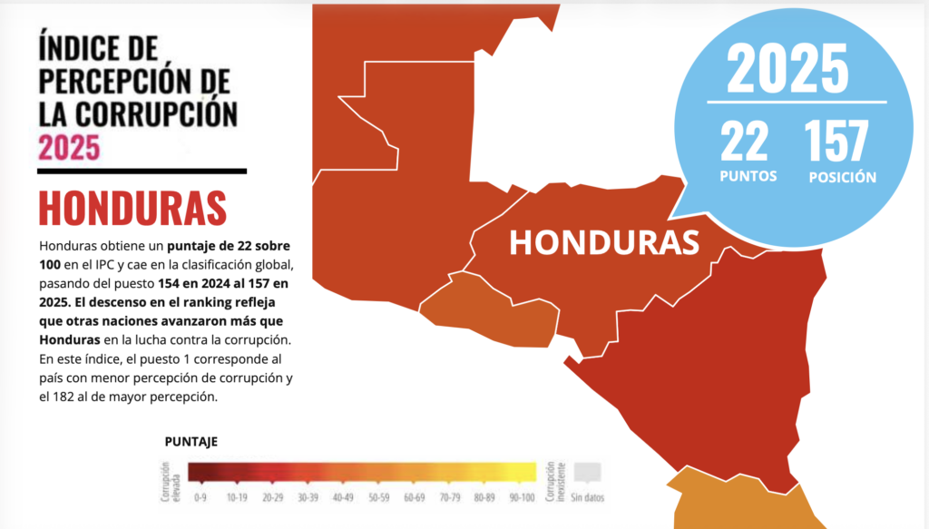 Honduras mantiene un deterioro sostenido en transparencia y combate a la corrupción. El Índice de Percepción de la Corrupción (IPC) 2025, de Transparencia Internacional, otorgó al país 22 puntos de 100, situándolo en el puesto 157 de 182 naciones evaluadas, tres posiciones más abajo en comparación con el año anterior.