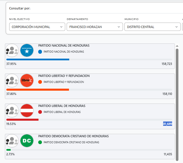 En la tercera posición se ubica el candidato del Partido Liberal, con un 19.53 % de la votación, consolidando una base significativa dentro del electorado del Distrito Central, aunque sin incidencia directa en la disputa por el primer lugar, dominada claramente por el Partido Nacional y LIBRE.