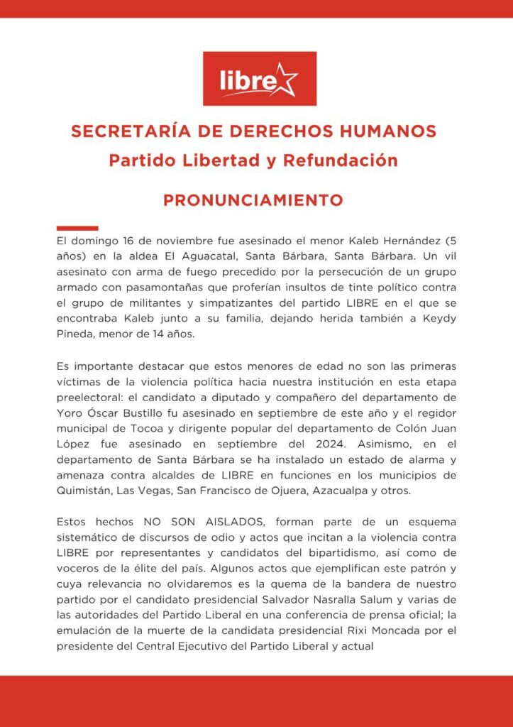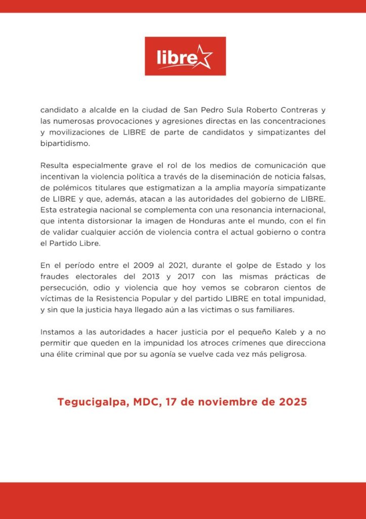 Tegucigalpa, Honduras.- El partido Partido Libertad y Refundación (LIBRE) expresó su más firme condena tras el asesinato del menor Kaleb Hernández.