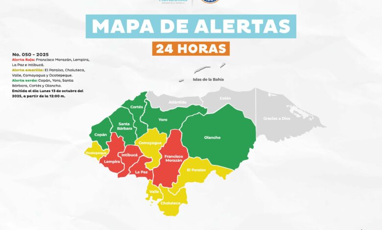 Tegucigalpa, Honduras – Secretaría de Gestión de Riesgos y Contingencias Nacionales (Copeco) informó que se extiende la Alerta Roja en cuatro departamentos del país debido a los pronósticos de lluvias generadas por el desplazamiento de una vaguada, que afecta principalmente el centro, sur y suroccidente de Honduras.