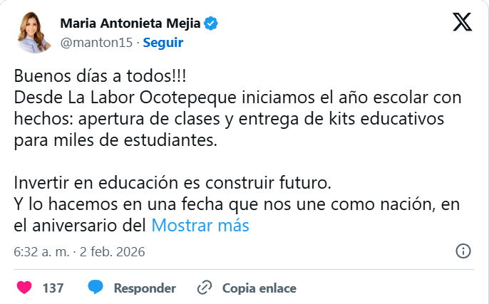 Tegucigalpa.- Con un mensaje de optimismo y compromiso nacional, la designada presidencial María Antonieta Mejía se pronunció en sus redes sociales sobre el arranque del año lectivo 2026 en Honduras. Bajo la firme convicción de que «invertir en educación es construir futuro», la parlamentaria resaltó que el regreso de los niños y jóvenes a las aulas es la oportunidad perfecta para reafirmar la educación como el pilar fundamental para la transformación de la sociedad hondureña.