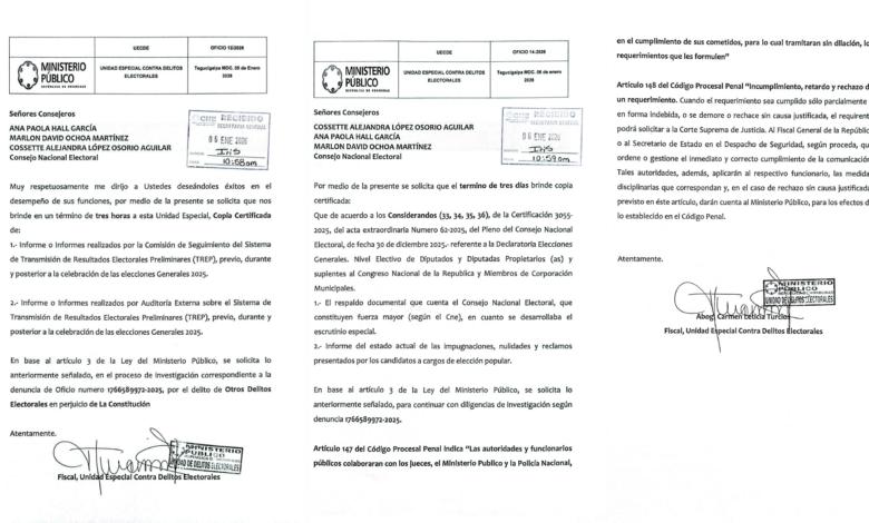 Entre la documentación requerida bajo apercibimiento legal, el Ministerio Público solicita en un plazo máximo de tres horas los análisis de resultados de la empresa ASD S.A.S., así como las auditorías externas y los informes de la Comisión de Seguimiento del TREP. Asimismo, la fiscalía demanda el respaldo documental que sustente las causales de “fuerza mayor” alegadas por el CNE durante el escrutinio especial, junto con un informe detallado sobre el estado actual de las impugnaciones y reclamos presentados por los candidatos.