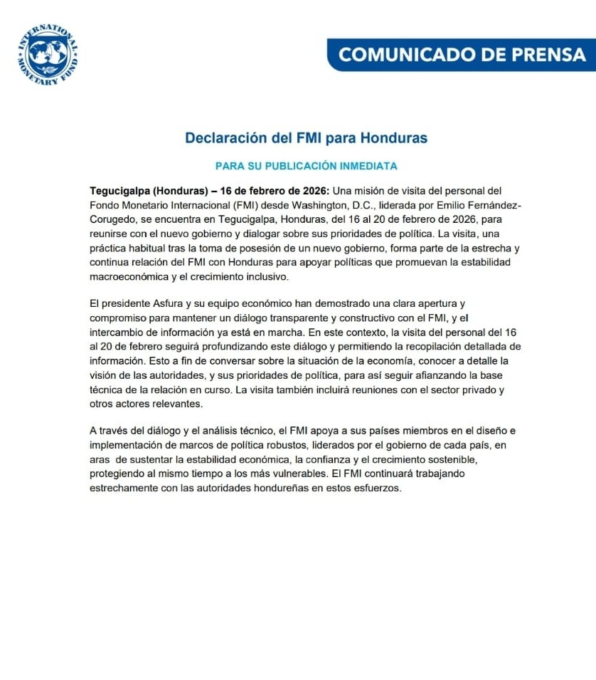 Tegucigalpa, Honduras – Una misión técnica del Fondo Monetario Internacional (FMI), procedente de Washington, D.C., se encuentra en Tegucigalpa del 16 al 20 de febrero de 2026 para sostener reuniones con el nuevo gobierno hondureño y conocer de primera mano sus prioridades de política económica.
