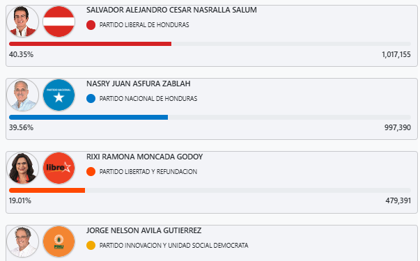 Tegucigalpa, Honduras – Con el 78.98% de las actas escrutadas, equivalente a 15,127 de las 19,152 actas del sistema electoral, el candidato del Partido Liberal, Salvador Nasralla, continúa liderando la contienda presidencial en el inicio del tercer día de revisión.