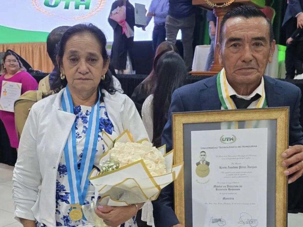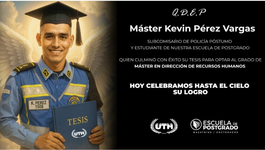 San Pedro Sula, Cortés – En una ceremonia conmovedora y llena de solemnidad, la Universidad Tecnológica de Honduras (UTH) rindió un emotivo homenaje al Sub Comisario Póstumo Kevin Pérez, entregando su título de máster en Recursos Humanos a sus padres, quienes recibieron el reconocimiento en nombre de su hijo.