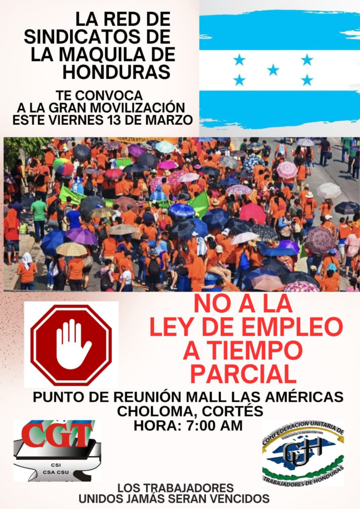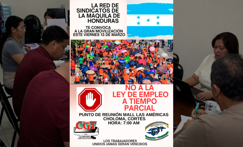 Choloma.- La red de sindicatos de la maquila, bajo el liderazgo de la Central General de Trabajadores (CGT), ha declarado la guerra a la propuesta de Ley de Empleo Parcial, anteriormente conocida como “Ley de Empleo por Hora”. La dirigencia obrera confirmó que el próximo viernes 13 de marzo se llevará a cabo la primera gran manifestación de trabajadores durante la administración del presidente Nasry Asfura.