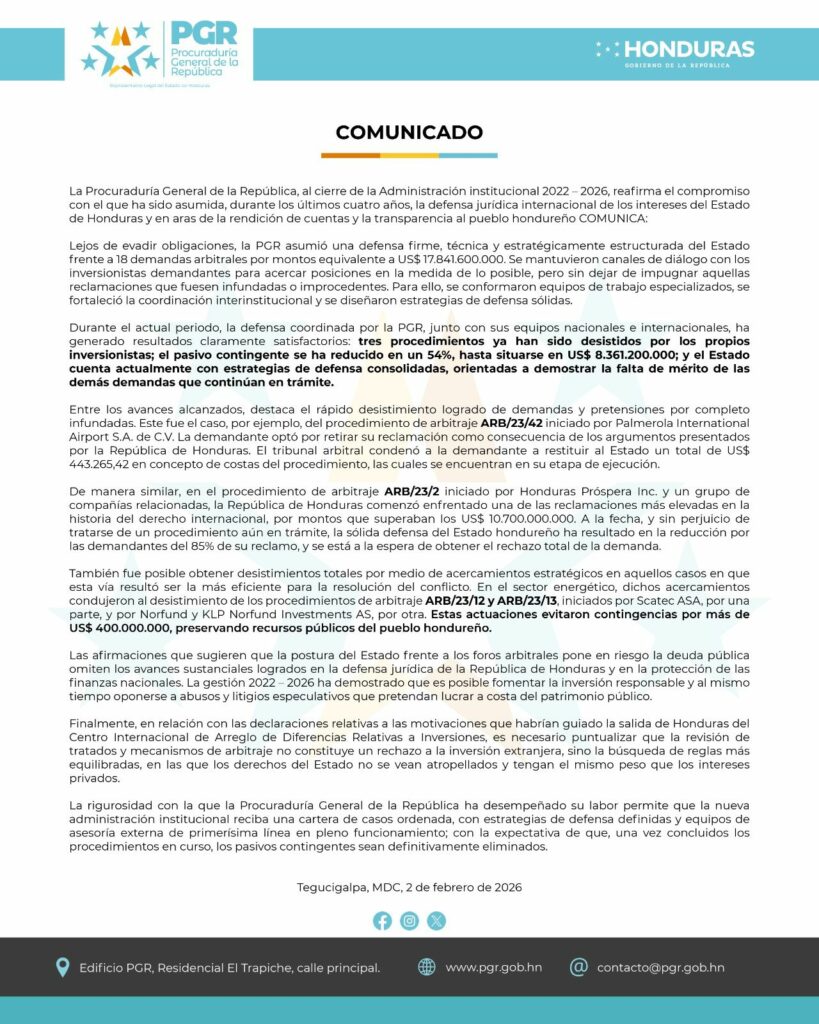 Tegucigalpa.- La Procuraduría General de la República (PGR) emitió un comunicado oficial al cierre de la administración 2022-2026, destacando resultados satisfactorios en la defensa jurídica internacional de Honduras. Tras enfrentar 18 demandas arbitrales que sumaban más de 17,800 millones de dólares, la institución logró reducir el pasivo contingente en un 54%, situándolo actualmente en 8,361 millones de dólares.