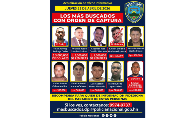 Honduras, Honduras – La Secretaría de Seguridad, a través de la Policía Nacional, presentó este viernes 24 de abril la actualización del afiche informativo de los criminales más buscados en el territorio hondureño, quienes cuentan con órdenes de captura vigentes por diversos delitos.