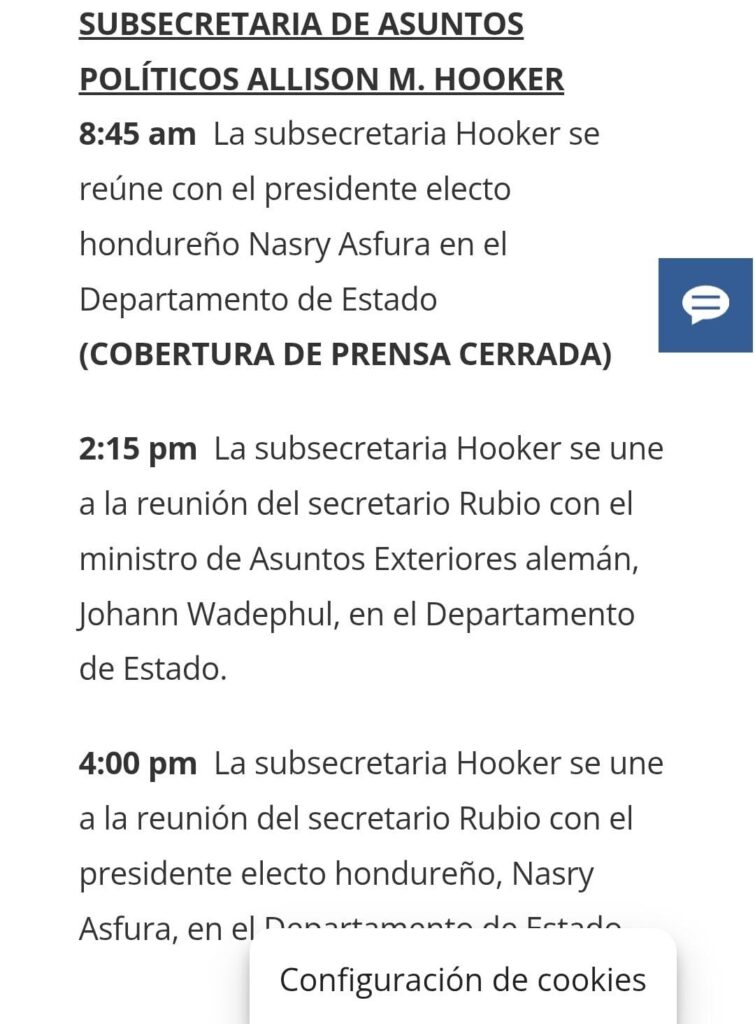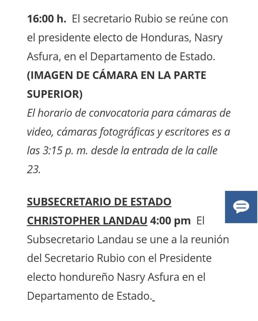 Posteriormente, a las 4:00 de la tarde, Asfura tiene previsto reunirse con el Secretario de Estado de los Estados Unidos, Marco Rubio, en un diálogo que contará además con la participación del Subsecretario Adjunto de Estado, Christopher Landau, y de la propia subsecretaria Hooker, lo que evidencia el alto nivel político del encuentro.