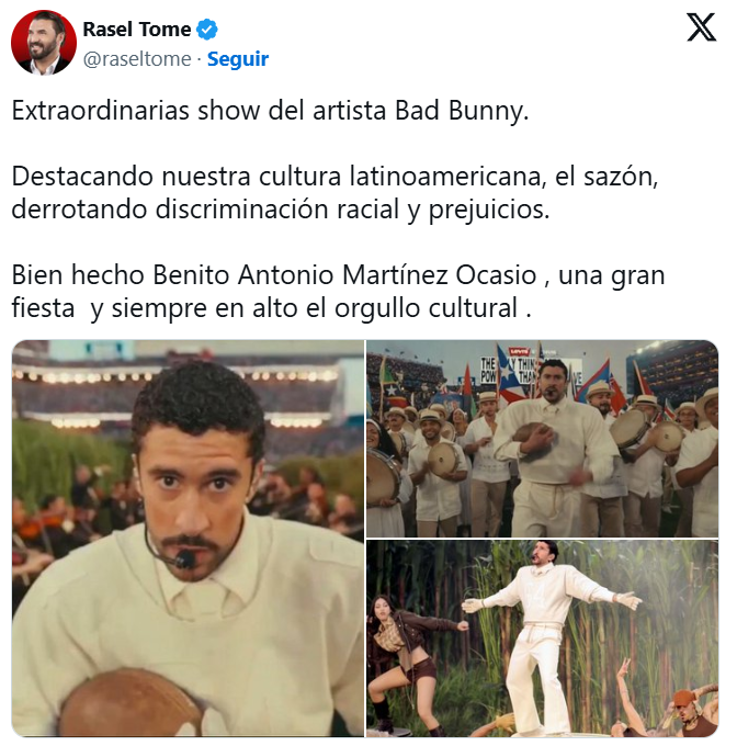 “Extraordinario show del artista Bad Bunny. Destacando nuestra cultura latinoamericana, el sazón, derrotando discriminación racial y prejuicios. Bien hecho Benito Antonio Martínez Ocasio, una gran fiesta y siempre en alto el orgullo cultural”, escribió Tomé en su cuenta de X.