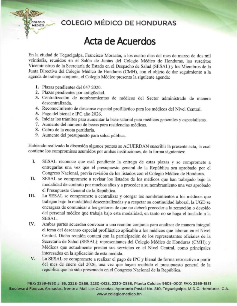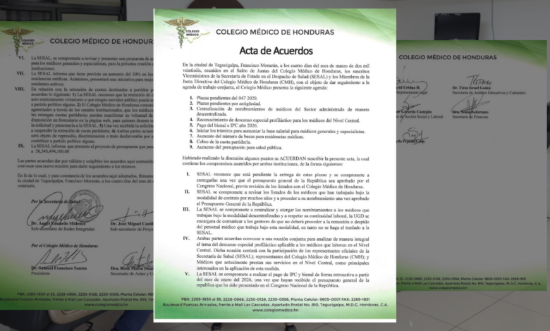 Tegucigalpa.- En una jornada decisiva para el sector sanitario, la Secretaría de Salud (SESAL) y el Colegio Médico de Honduras (CMH) suscribieron un acta de acuerdos que pone fin a la incertidumbre salarial de cientos de profesionales. La reunión, celebrada este 12 de marzo en la capital, establece compromisos concretos para cancelar las deudas vigentes y modernizar las condiciones contractuales del gremio.