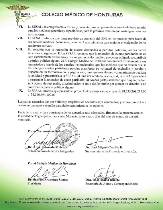 Nuevos incentivos y cuotas partidarias En un avance significativo para el bienestar del gremio, el documento firmado por el Dr. Ángel Midence y el Dr. Samuel Santos contempla mejoras en beneficios y libertad política:
