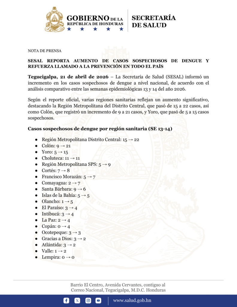 Tegucigalpa.- La Secretaría de Salud (SESAL) informó este 21 de abril de 2026 sobre un incremento en los casos sospechosos de dengue a nivel nacional. El análisis comparativo entre las semanas epidemiológicas 13 y 14 revela una tendencia al alza en múltiples regiones del país, lo que ha generado un llamado urgente a la población para eliminar los criaderos del mosquito Aedes aegypti.