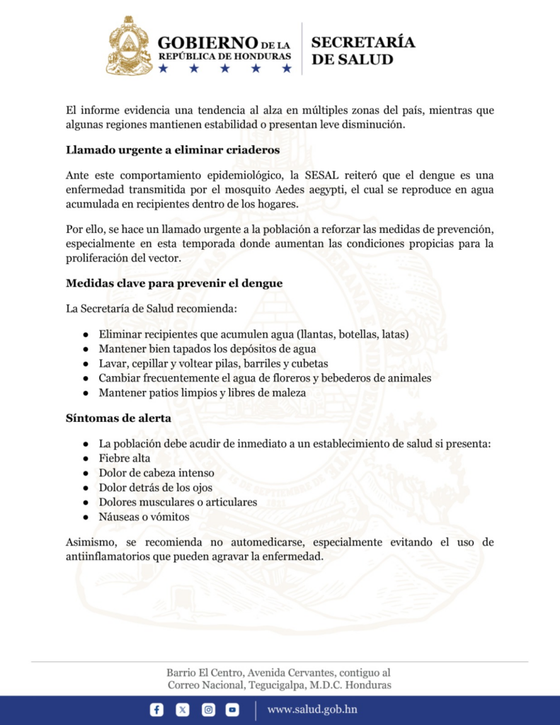 Síntomas de alerta: La población debe acudir de inmediato a un centro de salud si presenta fiebre alta, dolor de cabeza intenso, dolor detrás de los ojos, náuseas, vómitos o dolores musculares y articulares. Las autoridades enfatizan la importancia de no automedicarse, especialmente evitando antiinflamatorios que pueden agravar la condición del paciente.